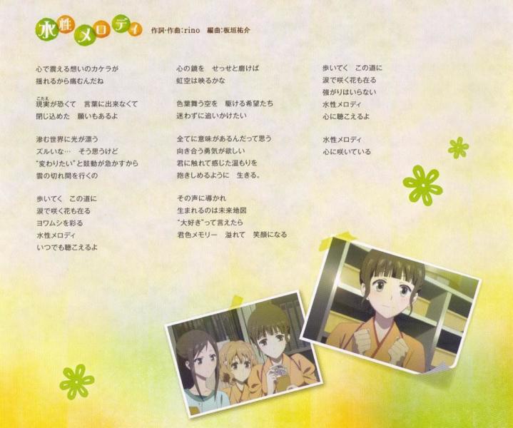 押水菜子(豊崎愛生)の「水性メロディ」歌詞ページです。作詞rino,作曲rino。花咲くいろは イメージソング (歌いだし)心で震える想いのカケラが 歌ネットは無料の歌詞検索サービスです。 花咲くいろは押水菜子のみどころ 女将「かっぱっぱ」 アニメ なこちかわいい。押水菜子 動揺(花咲くいろは) 押水菜子 動揺(花咲くいろは) 文学少女 動揺 (男子高校生の日常) キュゥべえ 動揺(魔法少女まどか☆マギカ) 月読鎖々美 pc 動揺 (ささみさん@がんばらない) 東雲なの 動揺(日常) 東雲なの 動揺(日常)